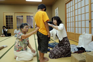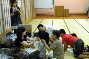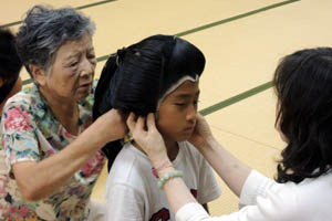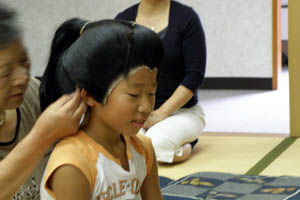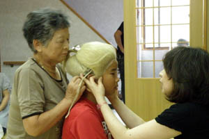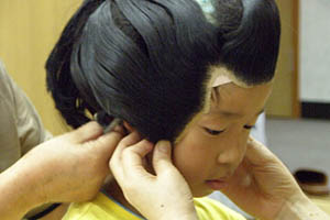 羽二重をつけてからかつらを合わせます。頭のサイズや形はひとそれぞれ。 ぴったり合わないとすぐにずれてしまい芝居どころでなくなります。こめかみの辺りでしめるのですが、 きつすぎると頭が痛いと泣き出すほどの痛さに・・・とても微妙な調整です。
