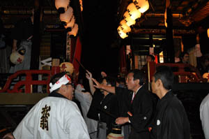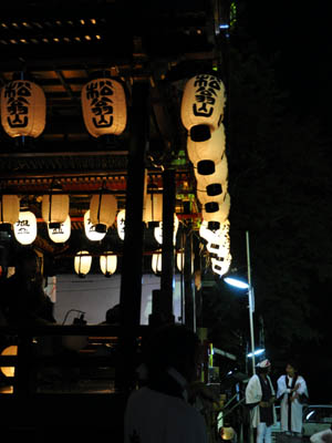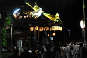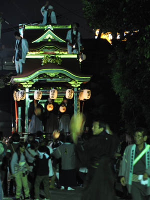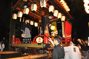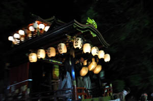 | 子供歌舞伎だけでなく是非ご覧いただきたいのが曳山の運行、特に提灯のあかりに照らされ