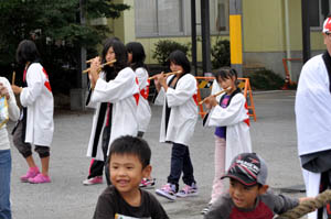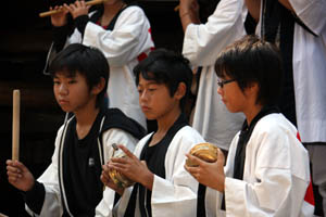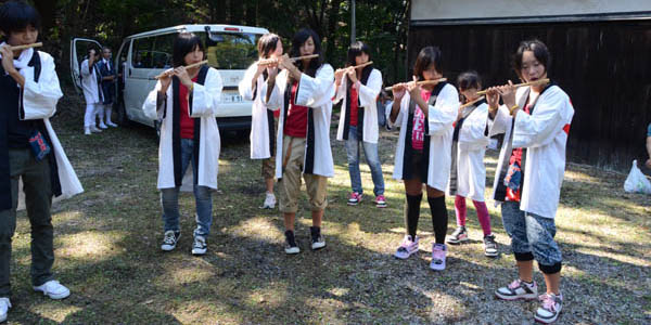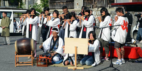 自分達で生で演奏したいという思いから平成二十年にしゃぎり保存会を発足させました。最初の年は出笛を吹くのがやっとでしたが二十一年は「神楽」を神前の狂言奉納の前にみなさんに披露しました。人に聴いていただくにはまだまだお恥ずかしいレベルでしたが、神前でしゃぎりを吹く事を目標に一年間稽古を重ねてきましたので、上手い下手は関係なく成果発表の場と考えて演奏しました。 |
