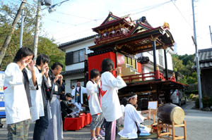 二十三年はレパートリーに追遣りを増やすとともに自分達の演奏を録音し、それまでずっと流していたテープから自分達のしゃぎりに切り替え運行することができました。また神前から南町への客山、北町の客山では、亭に男の子達を上げ、女の子は山の横で生で演奏しながら運行しました。 |