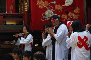 曳山を運行する際には必ず「しゃぎり」を鳴らします。笛数人、太鼓、摺鉦の構成で、