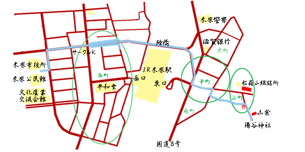 ↓ 平成21年の宵宮の運行 (水色の往復が移動範囲)